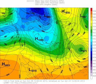The GFS model continues to push tropical cyclone Sandy northeastward into the north Atlantic next week. The model does not forecast the capturing of the tropical cyclone by an intense trough at 500 mb. The UKMET and MRF models are also forecasting this offshore track. However, the European model (ECMWF) and the Navy NOGAPS models continue to forecast what the GFS was forecasting a day or so ago: a very strong coastal low that tracks northwestward into the New York City metropolitan region on Monday and Tuesday of next week. In this scenario, a major storm would impact most of southern New England and all of the New York City metro area . This storm, if it forms, would bring flooding rains, coastal flooding and strong winds. The timing of the trough that is tracking in from the west will determine whether or not it will phase in with Sandy. If the timing is just right, the trough could entrain the moisture from the storm into it and then capture it bringing it towards the coast and intensifying it as it advects upper-level positive vorticity and provides strong upper-level divergence. Model agreement will be monitored over the next several days and the forecast will become clearer by this Friday or Saturday.